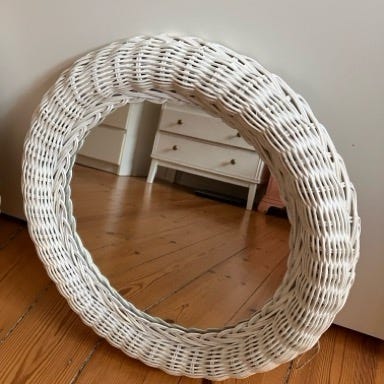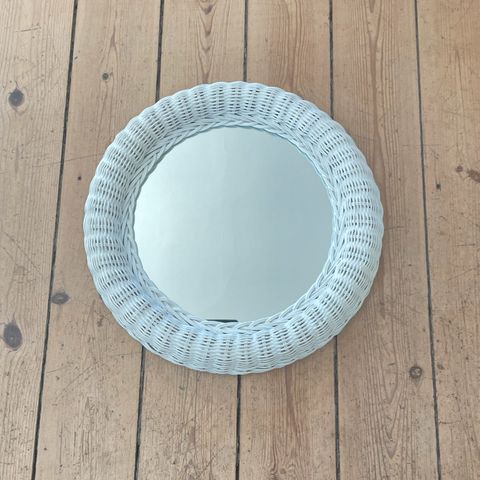 Skønt rundt spejl med ramme af hvid kurveflet. Udvendig diameter inkl ramme er 42 cm. Spejlets diameter er 30 cm.