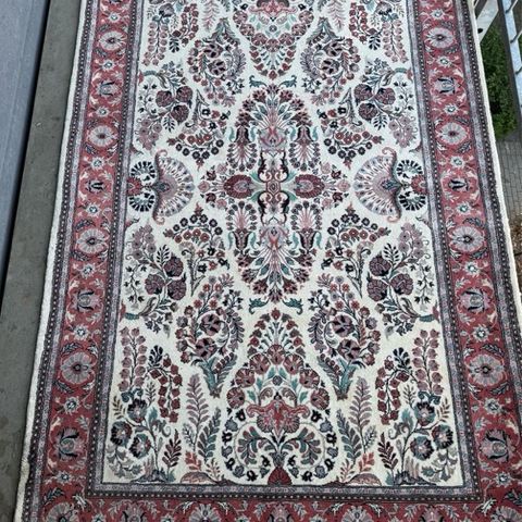 Sælger et flot, fladvævet tæppe i mørkegrå med lys kant hele vejen rundt.