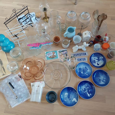 Det er en masse flotte glasting som vaser osv, gammel vægtelefon, el-knivsliber, div. ting og potteskjulere i messing, gamle ting som jern æbleslivepande, bollesprøjter og meget mere.