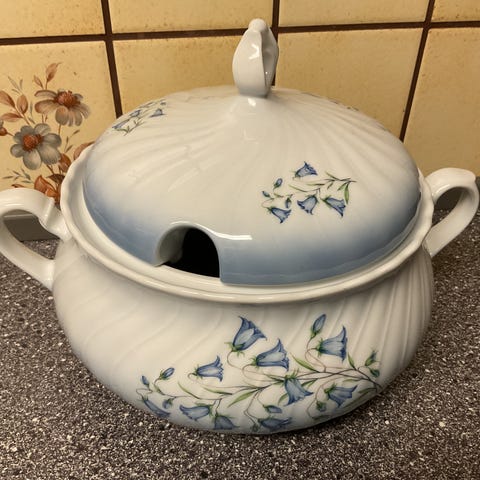 Firkløveren Christine Holm.klokkeblomst Porcelæn Sovseskål med underskål Sender