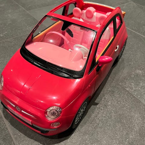Barbie Fiat 500 legetøjsbil i hvid og pink farve. Bilen kan åbne døre og detaljeret interiør med pink sæder og rat. Velegnet som legetøj til børn.