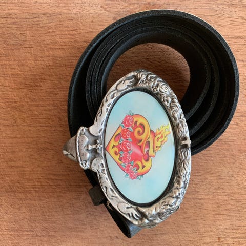 Læderbælte i kalveskind med bæltespænde i emaljeret metal designet af en fransk graffiti designer. Egnet til både mænd og kvinder.