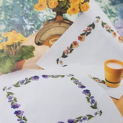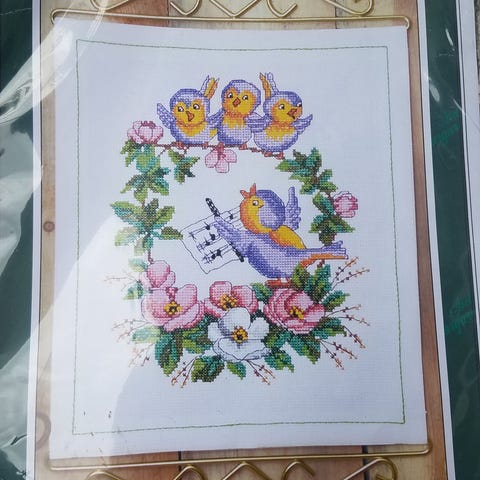 Broderi kit til broderi med "lovebirds" og lyserøde blomster. 25 x 34 cm. Kittet indeholder beskrivelse/mønster, stof samt broderi garn.