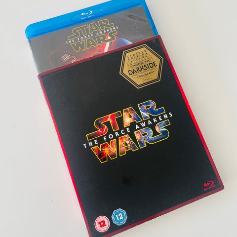 Star Wars The Force Awakens Blu-ray 2-Disc edition. Includes two discs with the movie and additional content. Suitable for ages 12 and above. Standard Blu-ray format in a blue plastic case.
