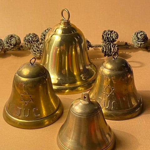 juleklokker i messing, gamle glaskugler og julepynt fra Daells Varehus.