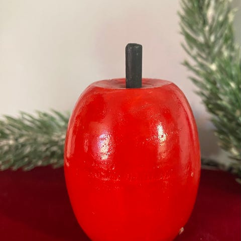 Til juledeko. Æblet er af træ og er 6,5 cm højt. Sivskoen er 8,5 cm lang.