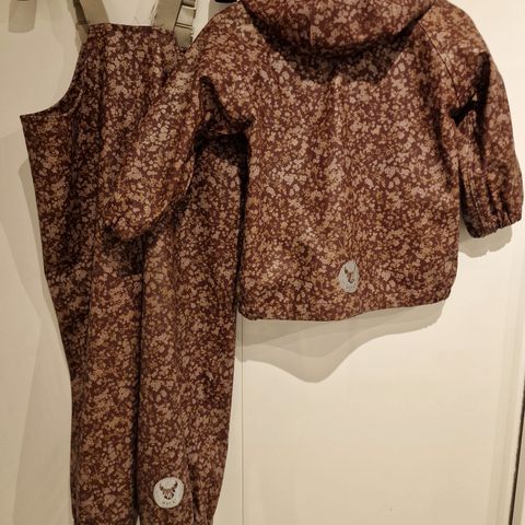 Regnsæt fra Wheat i støvet rosa bestående af regnbukser med seler og jakke med hætte.
