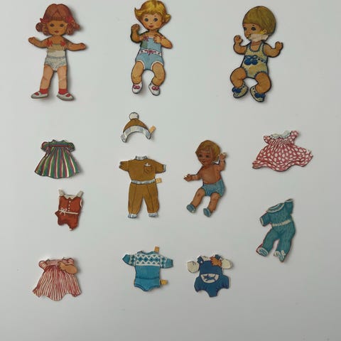 Sæt bestående af en vintage dukke med en blød krop, en bærepose/baby lift i lyserød med blå blomsterprint og flere små dukker i plastik. I alt 6 styk. Bæreposen/liften har en quiltet tekstur og en hvid rem til at bære. Dukkerne varierer i størrelse . Sættet kan bruges som samlerobjekt eller til leg.
