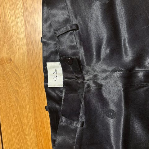Sorte vintage festbukser med blomster og glimmer, lavet i Frankrig, str. 2. Blomsterne og glimmer er malet på bukserne. Bukserne har lynlås, 4 lommer og mulighed for at bære belte. Kan snøres ind ved foden. Lavet af polyester/spandex. Lidt fnuller foran, ellers fint. Kan afhentes i Vanløse, Amagerbro eller Hørsholm.