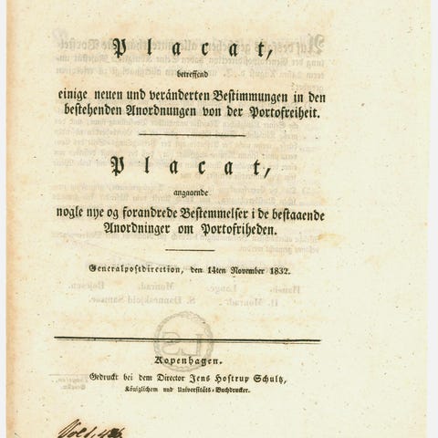 Original bekendtgørelse fra 24. december 1867 fra General-Postamtet i Berlin om portobestemmelserne for udveksling mellem posthusene i det nordtyske forbund. Offentliggjort i Amtsblatt für Hannover, Königreich Preußen. Hefte 118.