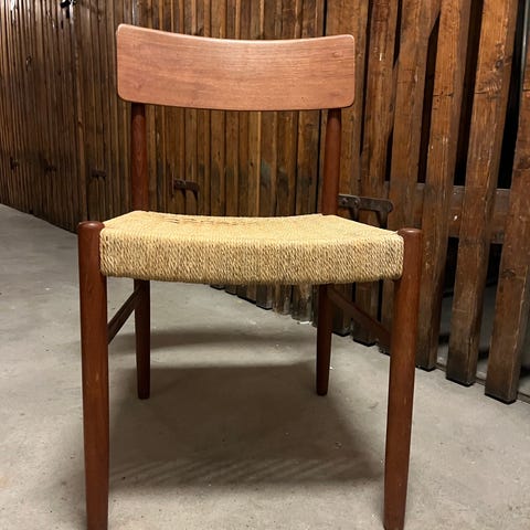 Tre stk fine stole i teaktræ, på stål stel og sæde er fransk flet