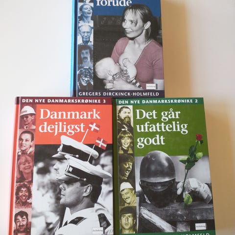 Den nye danmarkskrønike 1-3 (komplet). Af Gregers Dirckinck-Holmfeld. Bind 1: Hårde tider forude, Bind 2: Det går ufattelig godt, Bind 3: Danmark dejligst. Aschehoug, 1999, Stor Indbundet udgave med smudsomslag. Komplet i 3 bind. Fejlfrit eksemplar.