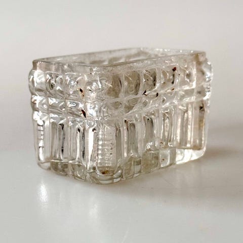 Saltkaret måler 3 cm i højde og 7,6 cm i diameter og fremstår som et typisk bordobjekt fra perioden, hvor individuelle saltkar var almindelige ved formelle måltider. Den ornamenterede overflade – ofte med geometriske eller florale motiver – er skabt ved hjælp af støbeforme, som både tilføjede dekorativ værdi og styrkede glassets struktur. Fodpladen giver stabilitet og løfter skålen visuelt, hvilket var en populær æstetisk løsning i datidens borddækning.