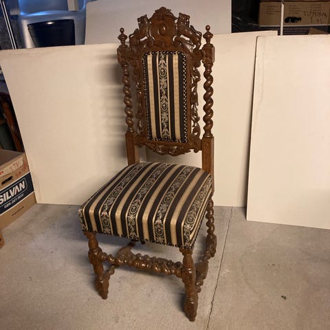 Tronstole, rigt dekoreret med ornamenter efter egyptisk forbillede. Af bemalet træ og MDF plade.