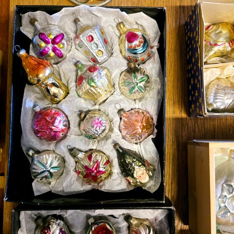 Juletræ kugler / julepynt af mundblæst og farvet glas, fra det tidligere Sovjetunionen / USSR / Ukraine. For størrelse, se fotos. I pæn stand uden skår, dog med forventelig patinering da de har en del år på bagen.