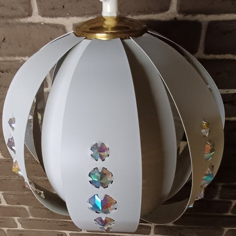 Lampeskærmen består af buede metalplader i en flot skinnende kobberfarve og en mat sort finish. Indlagt i skærmen er fire rektangulære glaskrystaller, der skaber et smukt farvet lysspil, når lampen er tændt.