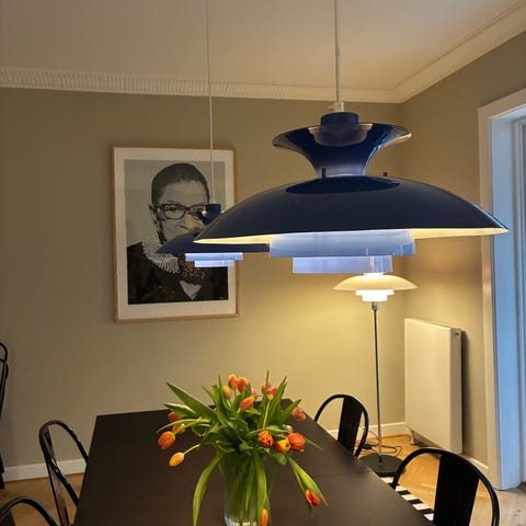 Smuk blå lampe. Minder om ph lampen. Kender nogen mon mærket bag?