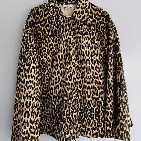 Skjorten har krave og trykknapper ned foran.