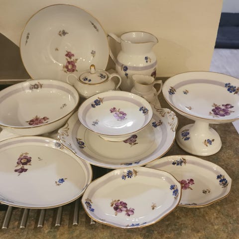 Spisestel Royal Copenhagen Brown Orchid, minimum 75 dele sælges samlet. Enkelte tallerkner med skår, resten i fin stand. Samlerobjekt og dekorativt.