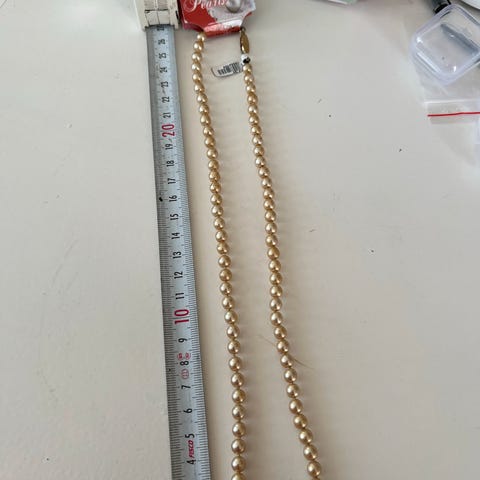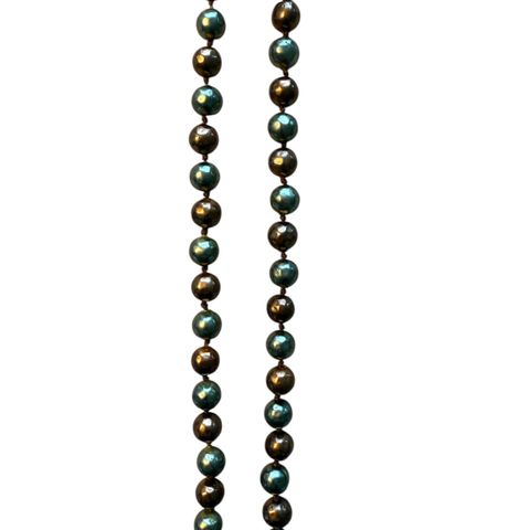 Sort perlekæde lavet af skiveformede perler, der er samlet i midten med en sølvlukning. Perlerne er størst i midt (1,6 cm) og bliver mindre og mindre (0,6 cm). Kæden er ca 54 cm lang i alt.