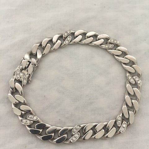 14kt hvidguld leddelt armlænke prydet med gennembrudte dekorationer og tre diamanter ca. 0,25ct i alt