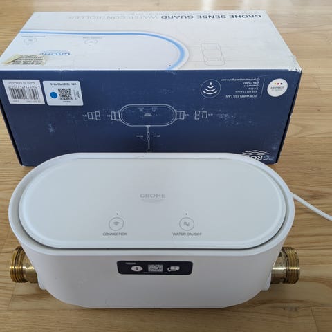 Grohe Sense Guard Smart. Elektronisk vandafbryder der holder øje med om vandtrykket falder. Kan via app kobles med andre vandalarmer i huset.