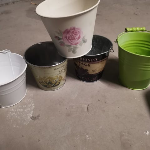 Syv forskellige krukker eller planteskjulere i beton. Forskellige størrelser og strukturer. Sælges samlet. MP 300. Afhentning.