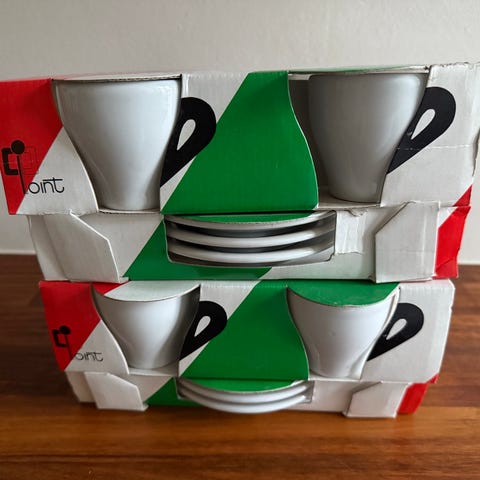 Espressokopper og underkopper i hvidt porcelæn. Sættet inkluderer 8 kopper og matchende underkopper, designet til espresso. Materialet er holdbart porcelæn, og designet er enkelt og funktionelt.
