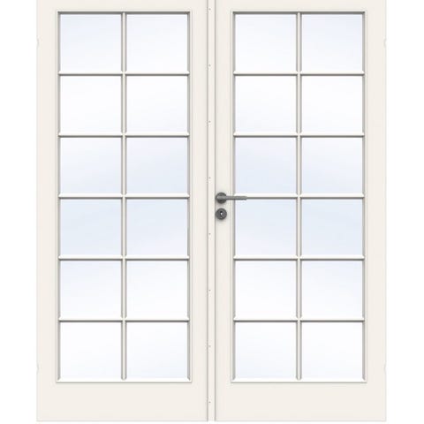 Easy GW3 Hvid Dobbeltdør (Swedoor) Glas med karm til indendørs brug. Stående dør med hvidmalet træ og glaspartier. Mål for hver af dørene: Højde 2040 mm, bredde 725 mm, tykkelse 40 mm.