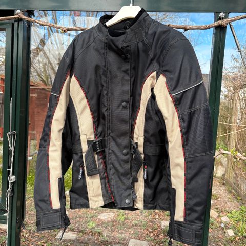 SÆGER DENNE MOTTOR CYKEL JAKKE.PÆN OG VELHOLDT.DET ER ENSTØRRELSE LARGE.OG MÆRKET HEDDER SAFETY.