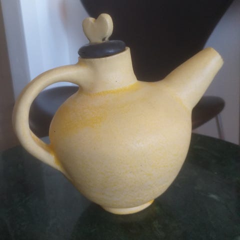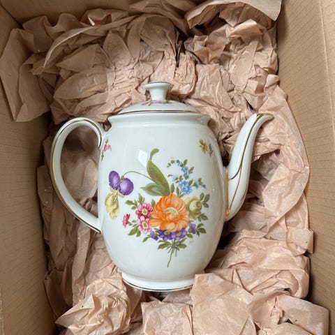 tekande, kaffekande, sukkerkande og flødekande. Sættet er lavet af porcelæn med en hvid base og dekoreret med lilla blomster og røde detaljer. Velegnet til servering af te og kaffe.