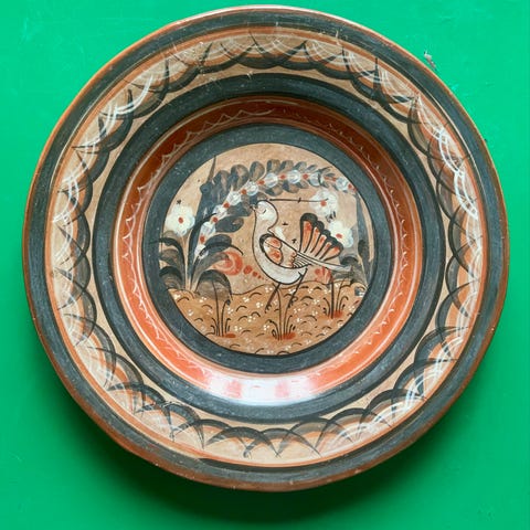 Lerskål på tre fødder med farvestrålende påmalet motiv af landsbyliv.