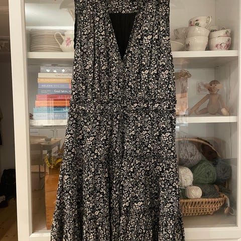 Blå kjole fra Second Female med et hvidt mønster. Kjolen har 3/4 lange ærmer med elastik i bunden og en elastisk talje. Den har en v-udskæring og knapper ned til taljen.