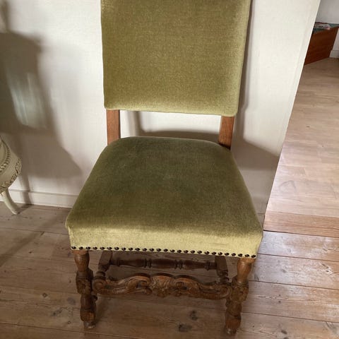 Gammel stol i flot stand. Grøn velour og løveføder.