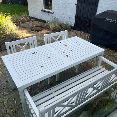 Havesættet er 2 år gammelt og sælges incl siddehynder og rygpuder med brede striber.