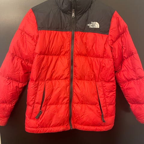 The North Face drengejakke i størrelse 164, farve orange. Jakken er designet til børn og har funktionelle detaljer som lynlåslommer og hætte. Materialet er velegnet til udendørs brug og giver beskyttelse mod vind og