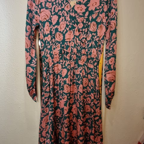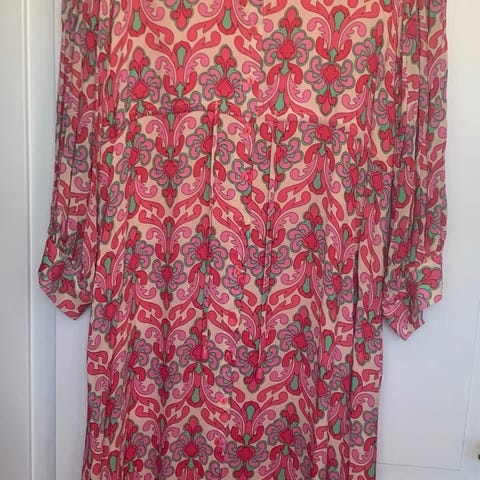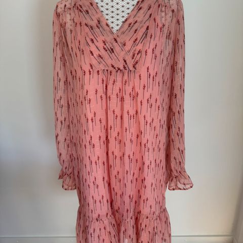 Smuk midi kjole i Autumn flower print brun/rød, 4 knapper stolpelukning, slids i begge sider og lille bindebånd i talje.