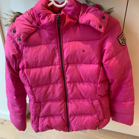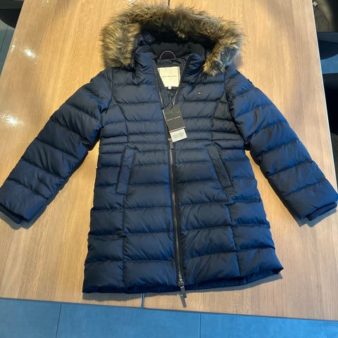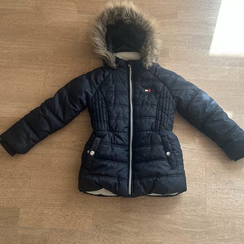 Tommy Hilfiger vinterjakke i størrelse 164 til piger. Jakken er sort og har en polstret, quiltet konstruktion med lynlås foran. Den har en aftagelig hætte med aftagelig pelskant ("fuskepels", som der så sødt står på norsk😆). Jakken har to lynlåslommer foran og vindfang i ærmer. Min datter har været virkelig glad for den, men hendes arme er blevet for lange😏
