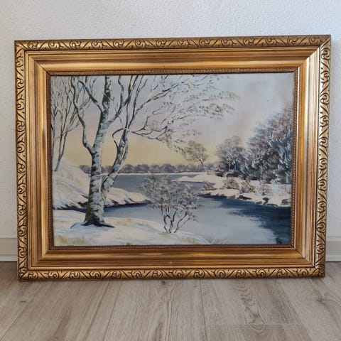 Vinterlandskab - Stort Dragende Maleri - træer skov og vandløb guldrammet 118x94