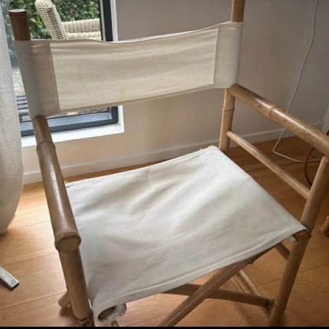 Fed instruktørstol med grønt stof. Der er en stor skjold på sædet.