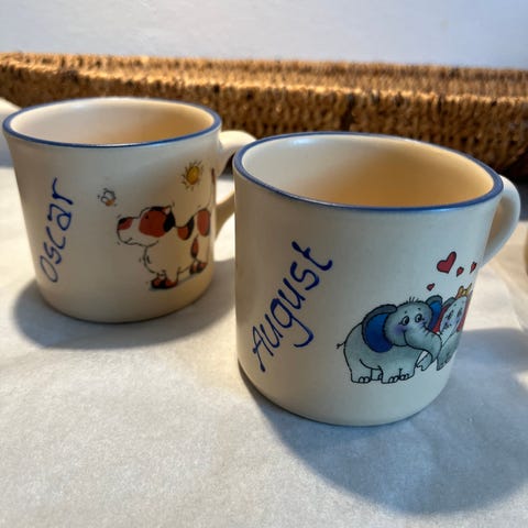 Krus / Kop til børn Steinbeck illustrationer. Porcelæn i fin stand, men er mørk rundt i bunden, se foto 3 - kan ikke huske om det var fra ny. Højde: 9 cm. Diameter: 8 cm. Se str. i forhold til coladåse på foto 4. Ann. nr. T576