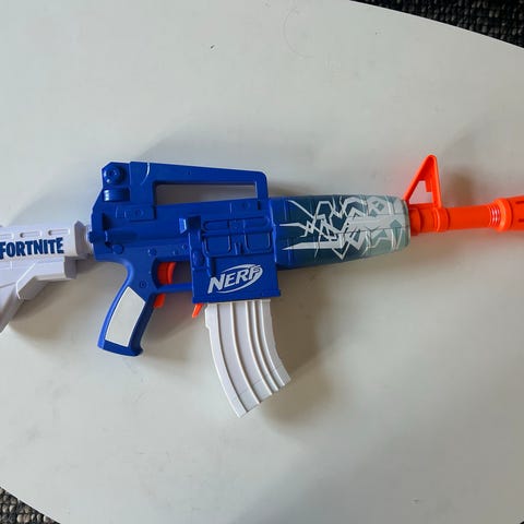 Fortnite legetøjsgevær lavet af plastik i blå og orange farver. Designet til børn som et legetøjsvåben til rolleleg og underholdning.