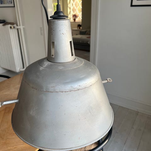 2 lamper / pendel i industrielt look, sølv/metal. Med 55 cm kædeophæng. Lampens diameter er 40cm.