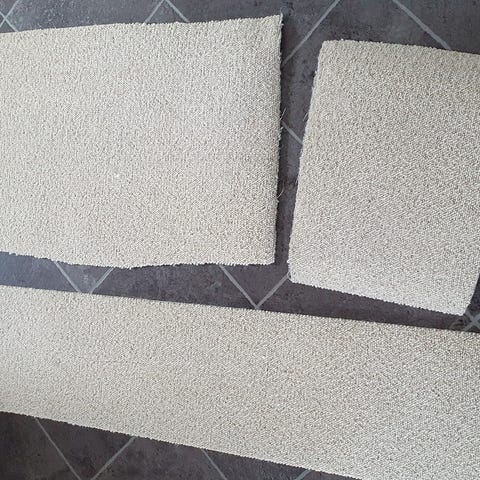 Fra ikke ryger hjem. Lyst og lækkert tykt. Ca. 1,5 cm tykt. Kan evt. bruges til hobby formål, måtter, isolering, på trapper eller.... Kun fantasien sætter grænser. Sælges i de mål de har eller kan også klippes til mindre stykker. Afhentes eller kan sendes ved fragt efter vægt.