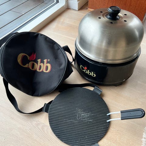 Cobb Dancook bærbar grill med tilbehør, inklusive låg, grillrist, varmefordeler og bærepose. Grillen er designet til udendørs brug og nem transport. Materialer inkluderer rustfrit stål og varmebestandige komponenter.