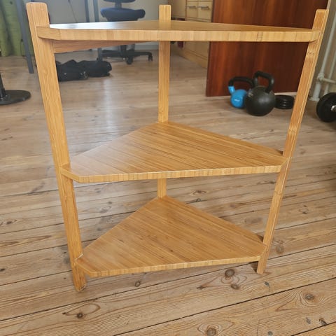 Hjørnehylder lavet af bambus træ med flere hylder til opbevaring. Hylden er designet til at passe ind i hjørner og kan bruges til opbevaring af planter, bøger eller andre småting. Materialet er bambus, som giver et naturligt og let udtryk. Sælges pr stk 100 tingene på hylderne kan medkøbes kom med et dog ikke VW kurs og børsterne 🤠