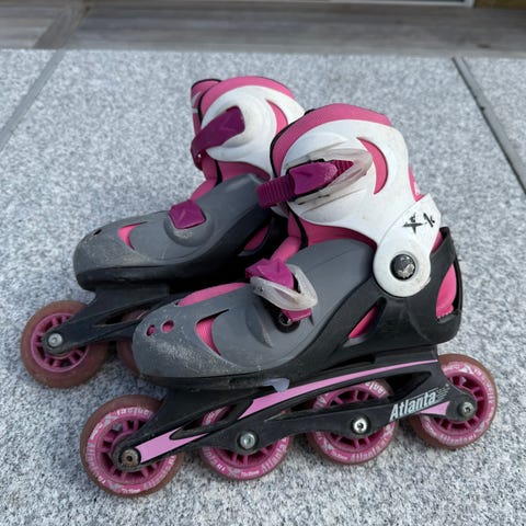 Justerbare rulleskøjter med bremseklods på begge skøjter. I meget god stand.