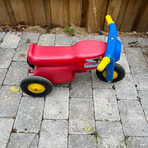 Løbecykel Børne legetøj i rød og blå farve. Fremstillet i plastikmateriale med tre hjul for stabilitet. Designet til små børn til at øve balance og motoriske færdigheder.