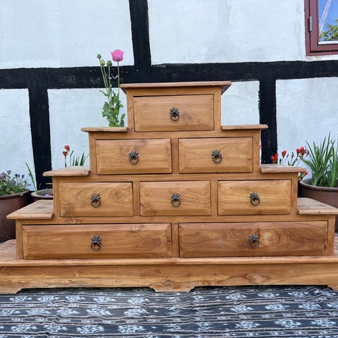 Lad dig forføre af dette unikke møbel, et orientalsk produceret skuffedarie med tre praktiske skuffer. Udført i et robust, men ukendt asiatisk træsort, der bærer en varm, mahogni-bajset overflade, får det et udtryk af dybde og varme.