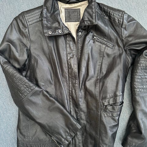 Kort bruge kalveskinds jakke i str 38/40. Lukkes med lynlås. Beige foer samt 2 lommer med lynlås.